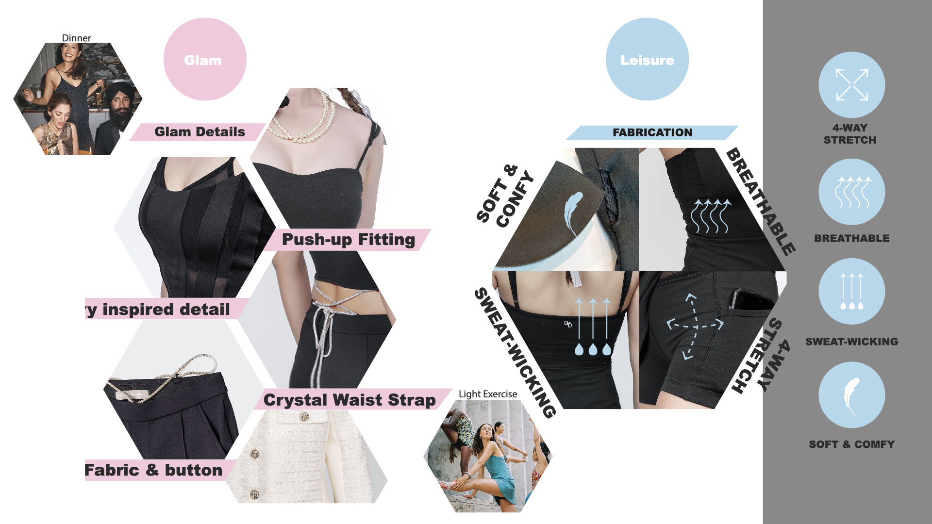 Our styles are versatile which could be worn in work/light exercise (daytime) and also in dinner/party (night-time). We are dedicated to making women’s wardrobes more sustainable as our styles serve them in multiple contexts.